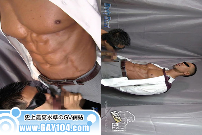 ケツを掘られた色黒アニキがスーツ姿で再登場。シャツのボタンを外すと夏に向けてさらにバッキバキになった腹筋をお披露目。プリッとしたケツを筋肉ゴーグルマンにわしづかみ!!マッサージ機を股間に当てられ気持ちよくなってたところで、どでん!!と赤黒いチンコが登場。乳首をいじられると徐々に勃起しはじめ筋肉ゴーグルマンにフェラされてしまいます。最後は筋肉ゴーグルマンにぶっかけちゃいました。本編メインモデルに目隠しはございません。